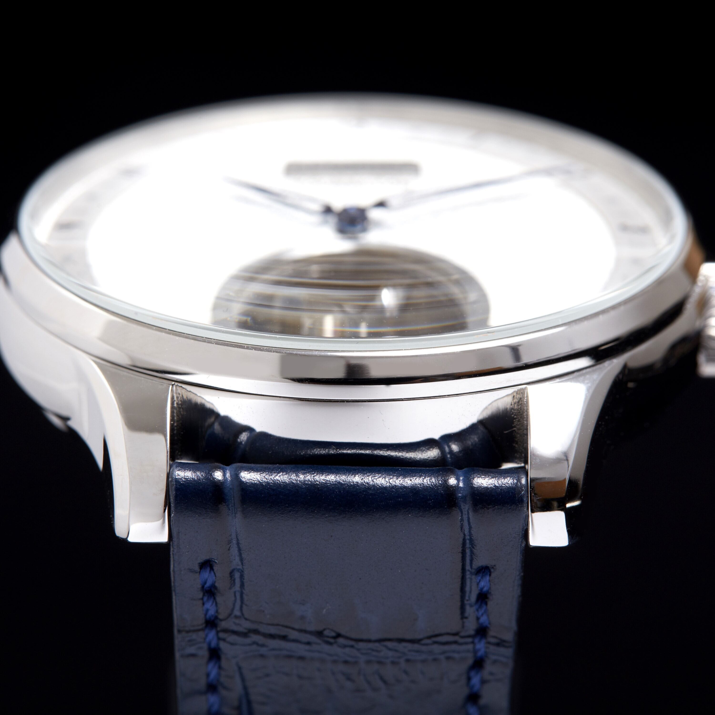 シンプルで高級感がある文字盤にトゥールビヨンの繊細な回転が映える逸品。